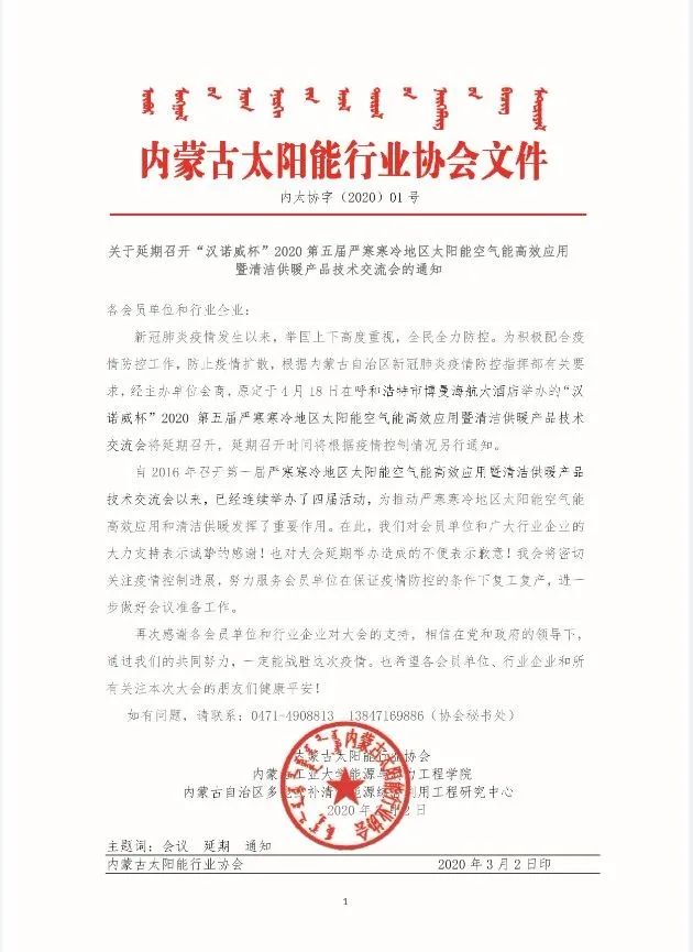新冠肺炎疫情發(fā)生以來,舉國上下高度重視,全民全力防控。為積極配合疫情防控工作,防止疫情擴(kuò)散,根據(jù)內(nèi)蒙古自治區(qū)新冠肺炎疫情防控指揮部有關(guān)要求,經(jīng)主辦單位會(huì)商,原定于4月18日在呼和浩特市博曼海航大酒店舉辦的“'漢諾威杯'2020第五屆嚴(yán)寒寒冷地區(qū)太陽能空氣能高效應(yīng)用暨清潔供暖產(chǎn)品技術(shù)交流會(huì)”將延期召開,延期召開時(shí)間將根據(jù)疫情控制情況另行通知。